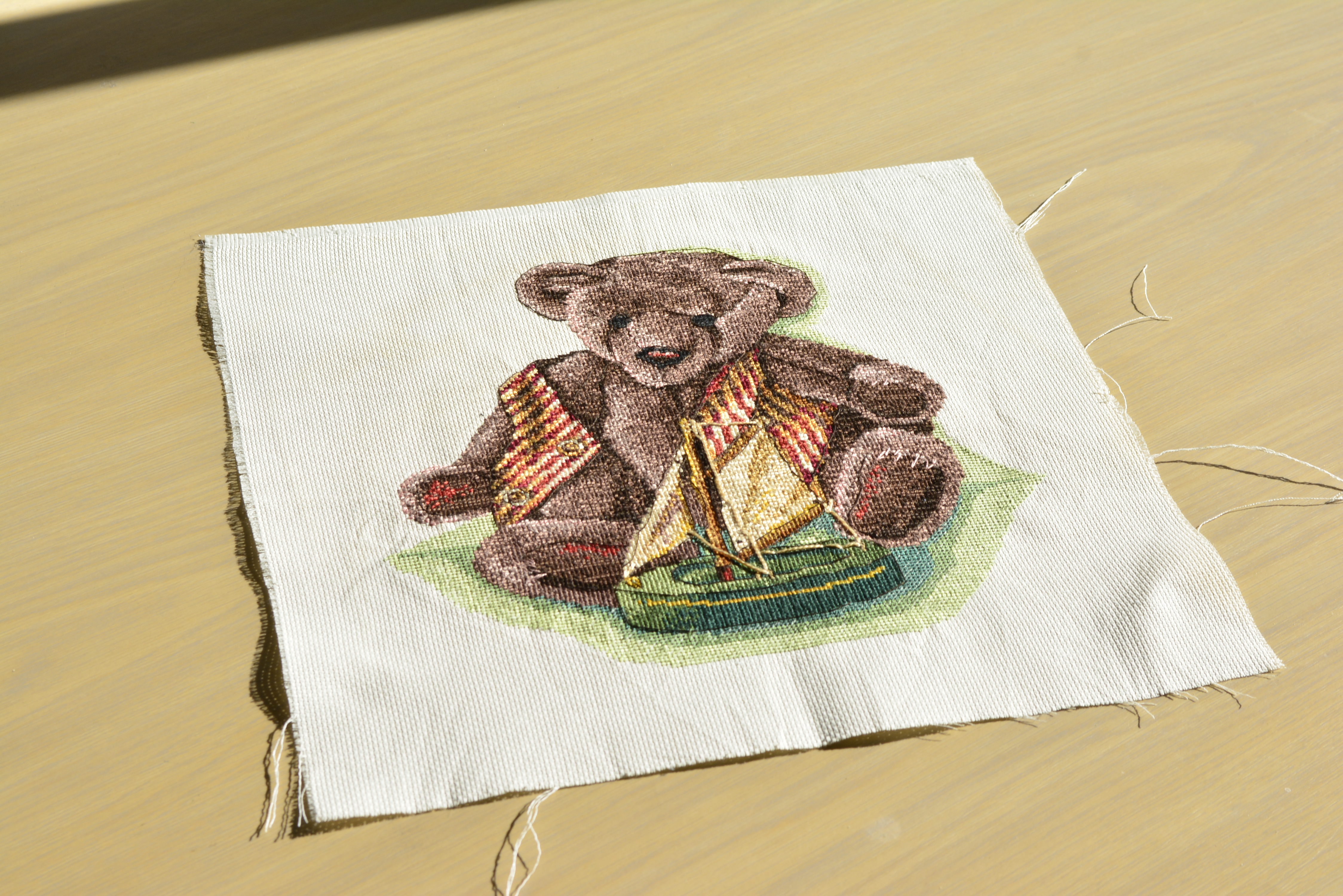 What you may also notice with the bear below is how dirty the fabric is. Another huge mistake! What I’ve learnt over time and what many of you may know is that it’s a sin for a stitcher to stitch with dirty hands and to leave their fabric dirty when it’s finished. Why? Aesthetically, it looks grubby, messy, unprofessional. Technically, the grub, grime and muck can attract bugs, mites and other nasty critters that can feed off it and eventually ruin the picture. Additionally, there’s the risk of the piece growing mould or remaining stained for the rest of its life because I’ve not washed it soon enough and ensured it’s dried and stored properly.