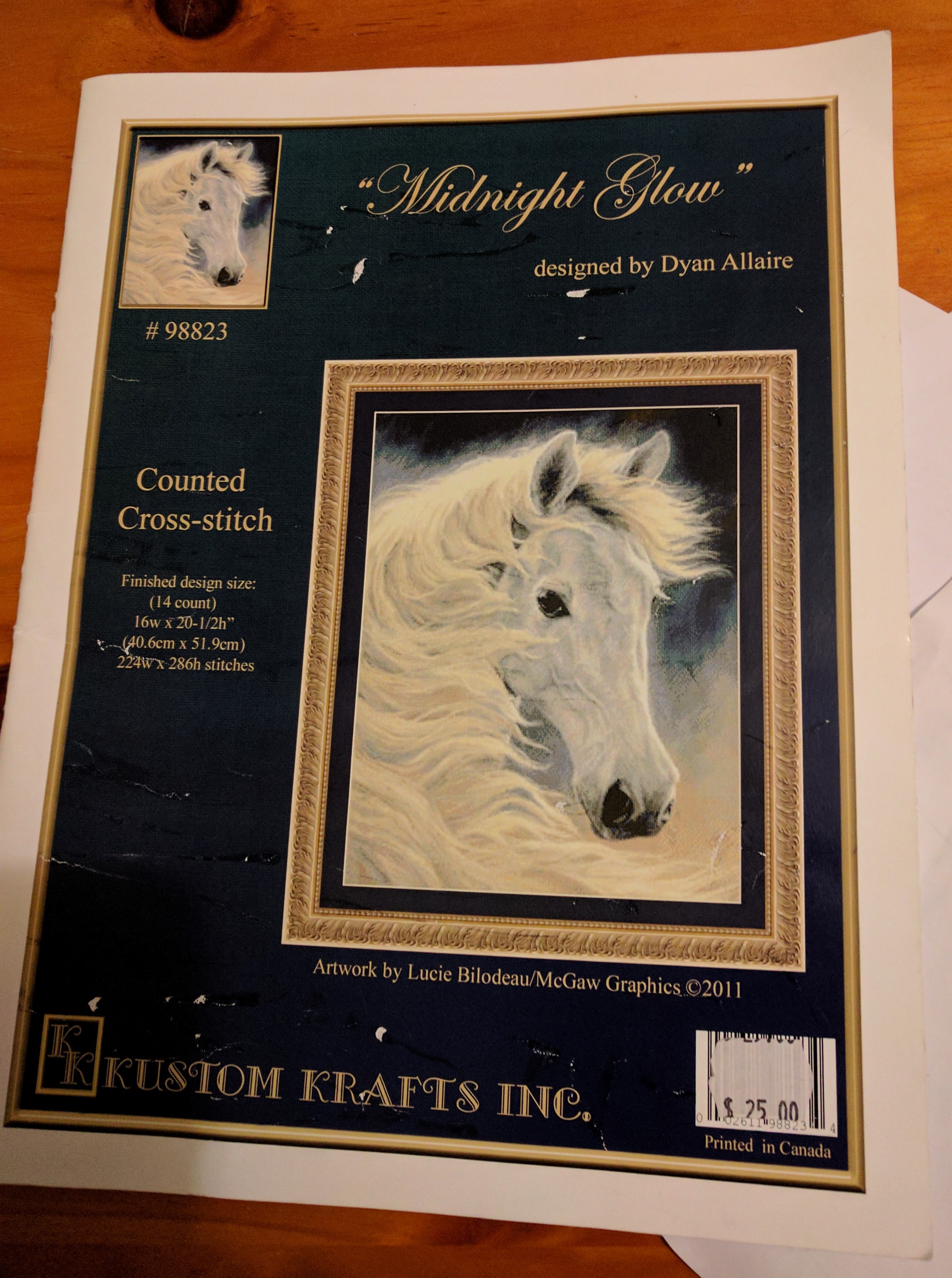 Maths, numbers and I have never really gotten along. In the world of cross-stitch, this means that I have trouble calculating how much fabric I need for a project – especially if I’m choosing to stitch a project on a different count of fabric to what the artist recommends. For example, the image of the white horse as shown below, is the best example of when I have gotten the measurements really wrong.
