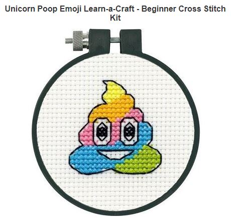 According to the 123Stitch.com website, this Unicorn Poop Emoji kit comes with everything, including 11 count Aida, the black hoop we see in the picture and all of the things needed to complete the project. This particular kit I think ticks alot of the boxes for kids these days because it’s poop! Also, in Australia at the moment, the unicorn theme has been strong and emojis seem to be here to stay, so why not embrace them?!