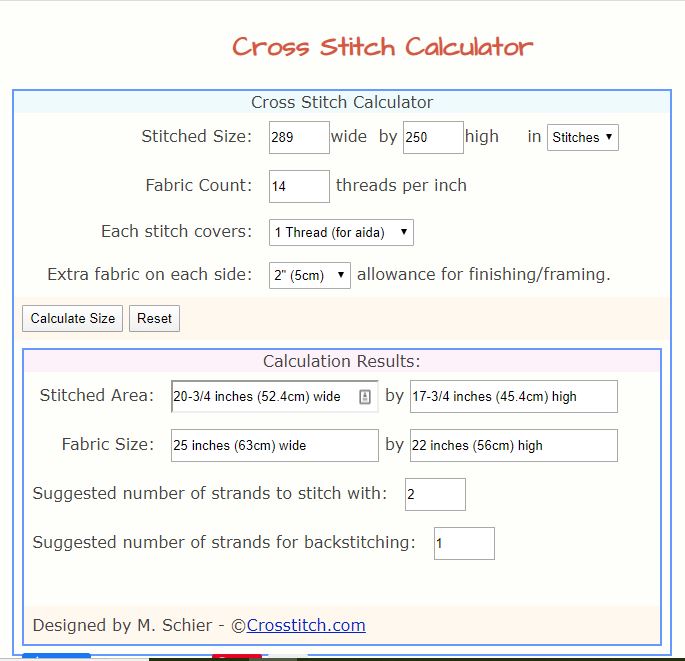 Sometimes the designer may not state how much extra fabric you will need to stitch your project. They will just state how big the project is and recommended fabric. For example, the stitch size may be 289w by 250h on 14 count navy blue Aida. This is where a fabric calculator can be helpful to calculate how much you will actually need. The website Crosstich.com has an awesome calculator that’s very easy to use. Below is an example of how it works, using the dimensions I’ve used in this paragraph: