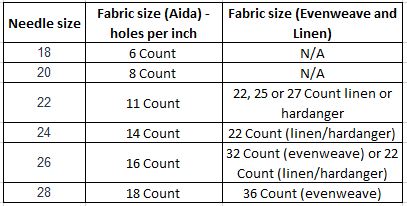 The size of the needle you use for your project will depend on the size of fabric you’re using. Using the right needle size will mean you’re stitches will be neater and there won’t be any obvious holes from your needle. Below is a table of what needle size you’ll need for the fabric size you may be stitching on: