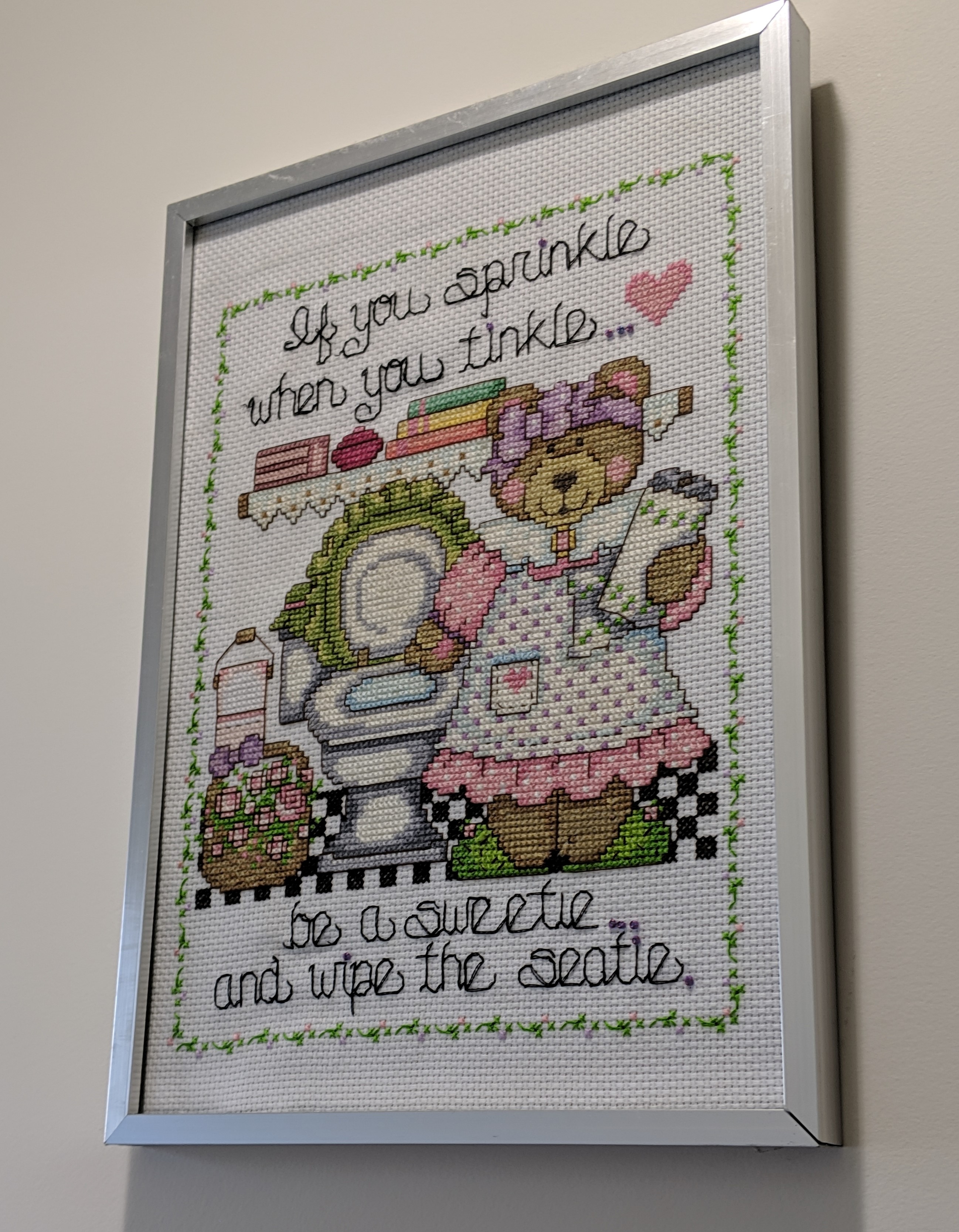 I started stitching this picture about 9 years ago when I was visiting my grandparents on the Gold Coast, Qld, Australia. This picture would be one of the first pictures I would hang in my house that I would move into in August 2010. When I was finishing off the patter, I wasn’t confident in my French Knot abilities, so I used Mill Hill Beads instead. The additional embellishment I did was use black metalic thread instead of the 310 DMC black thread.